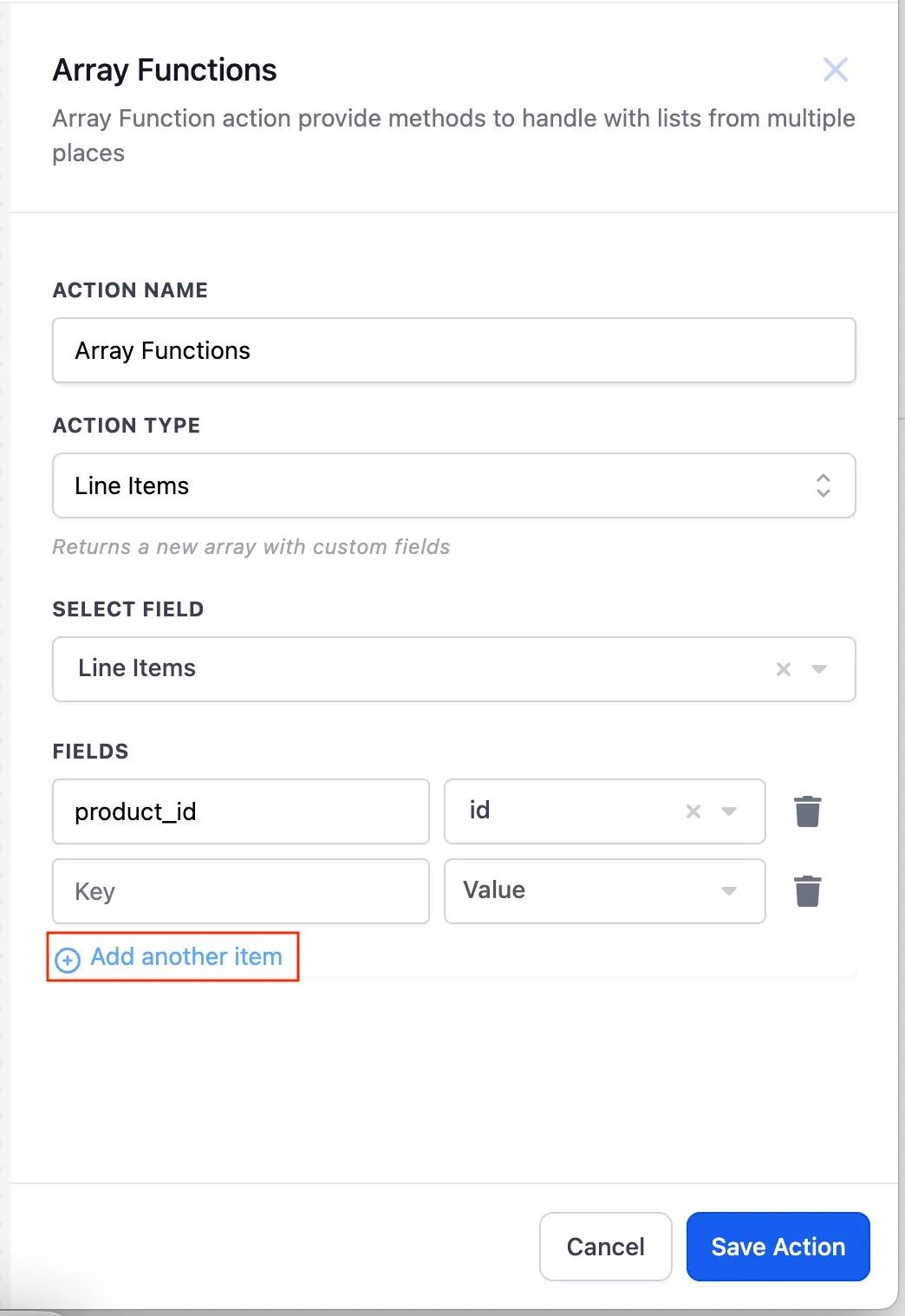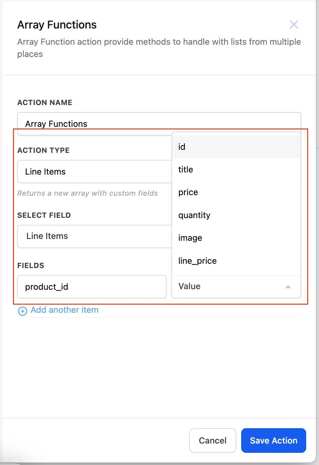 Wählen Sie den Aktionstyp "Line Items" aus dem Dropdown-Menü. Dieser Aktionstyp hilft dabei, ein Array mit benutzerdefinierten Schlüsseln neu zu konstruieren.