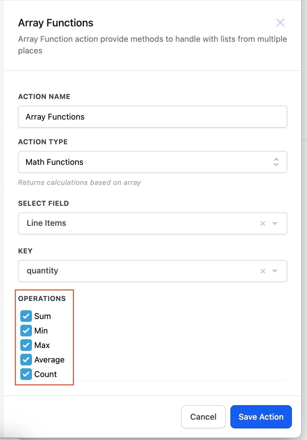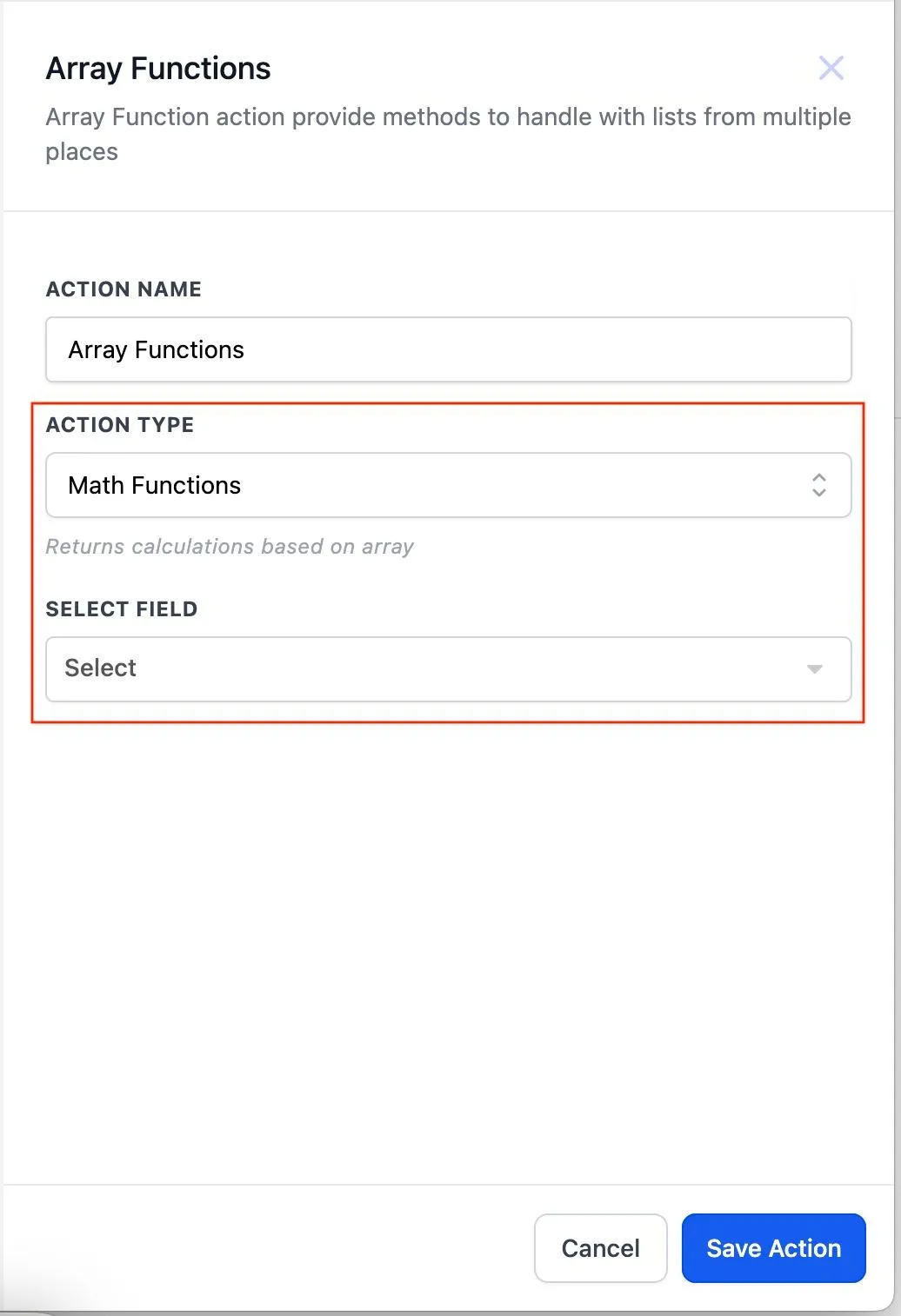 Wählen Sie den Aktionstyp „Math“ aus dem Dropdown-Menü. Dieser Aktionstyp hilft dabei, Summe, Min, Max, Durchschnitt durch Abgleichen von Schlüssel-Wert in einem Array von Objekten zu berechnen
